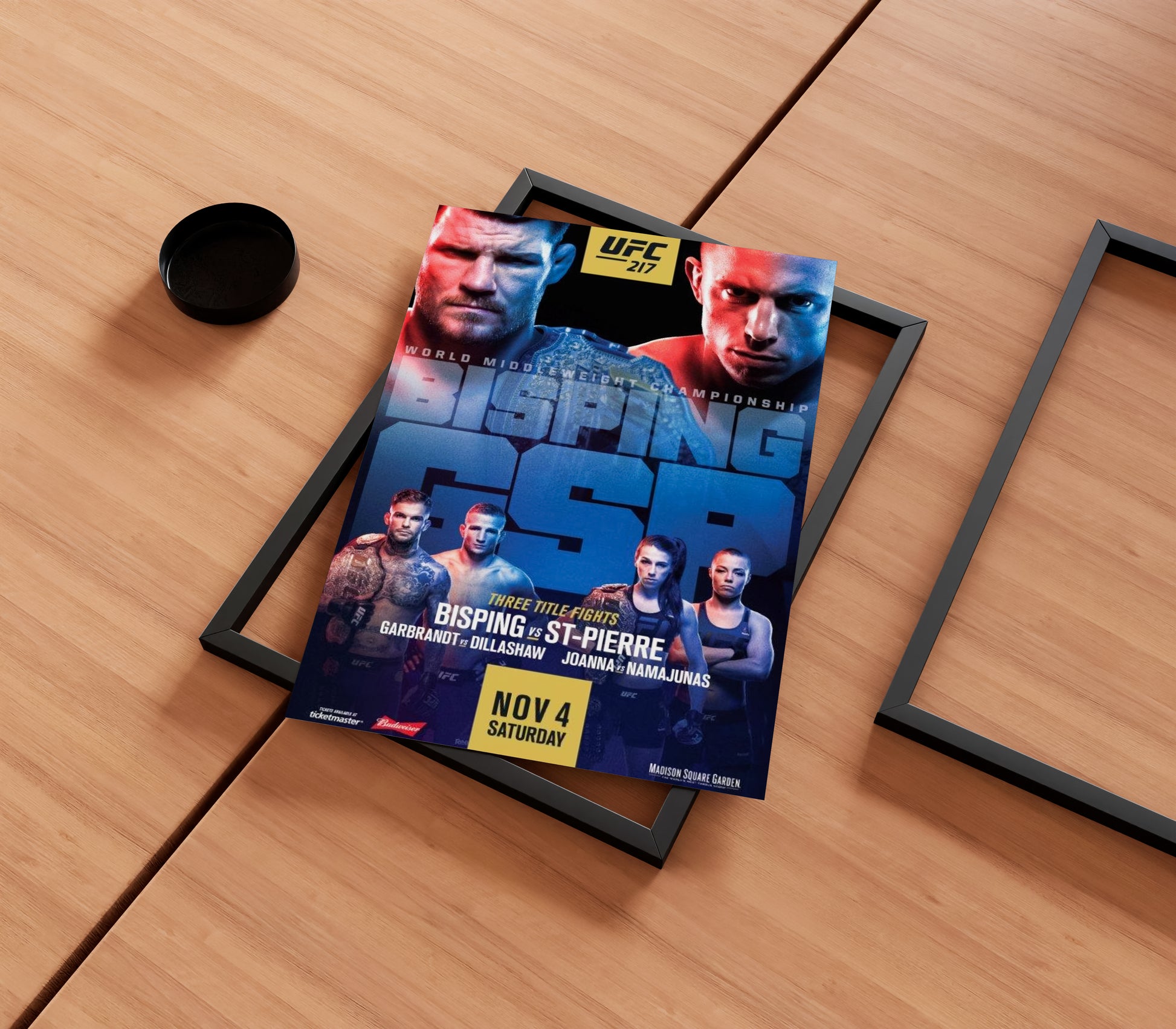 Celebrate one of UFC's most iconic battles with the UFC 217 'Bisping vs GSP' poster. This expertly designed piece captures the intensity and significance of the fight, making it a perfect addition for dedicated fight fans and collectors. Printed on high-quality material, it offers sharp visuals and lasting durability, ideal for displaying in any fight room or sports memorabilia collection. Relive the moment when two champions clashed in an unforgettable showdown.